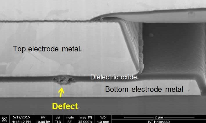 (2) 双光束FIB切片(图2-2)立即揭示介电氧化物层的缺陷!烧坏的绝缘层导致顶部和底部电极金属泄漏。