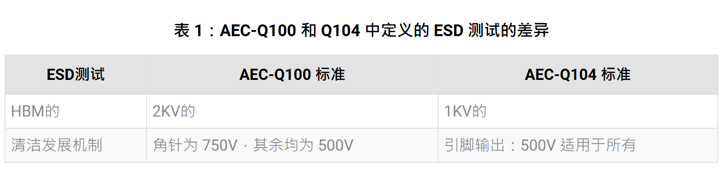为了解决 MCM 内部组件的内部复杂性,AEC-Q104 规范中引入了一些更改。关于ESD测试项目:人体模型(HBM)的最低要求从AEC-Q100中定义的2KV降至1KV;关于充电器件型号 (CDM):AEC-Q100 将角引脚设置为 750V,其余引脚设置为 500V,而 AEC-Q104 将所有引脚(无论引脚输出位置如何)设置为 500V(详见表 1)。